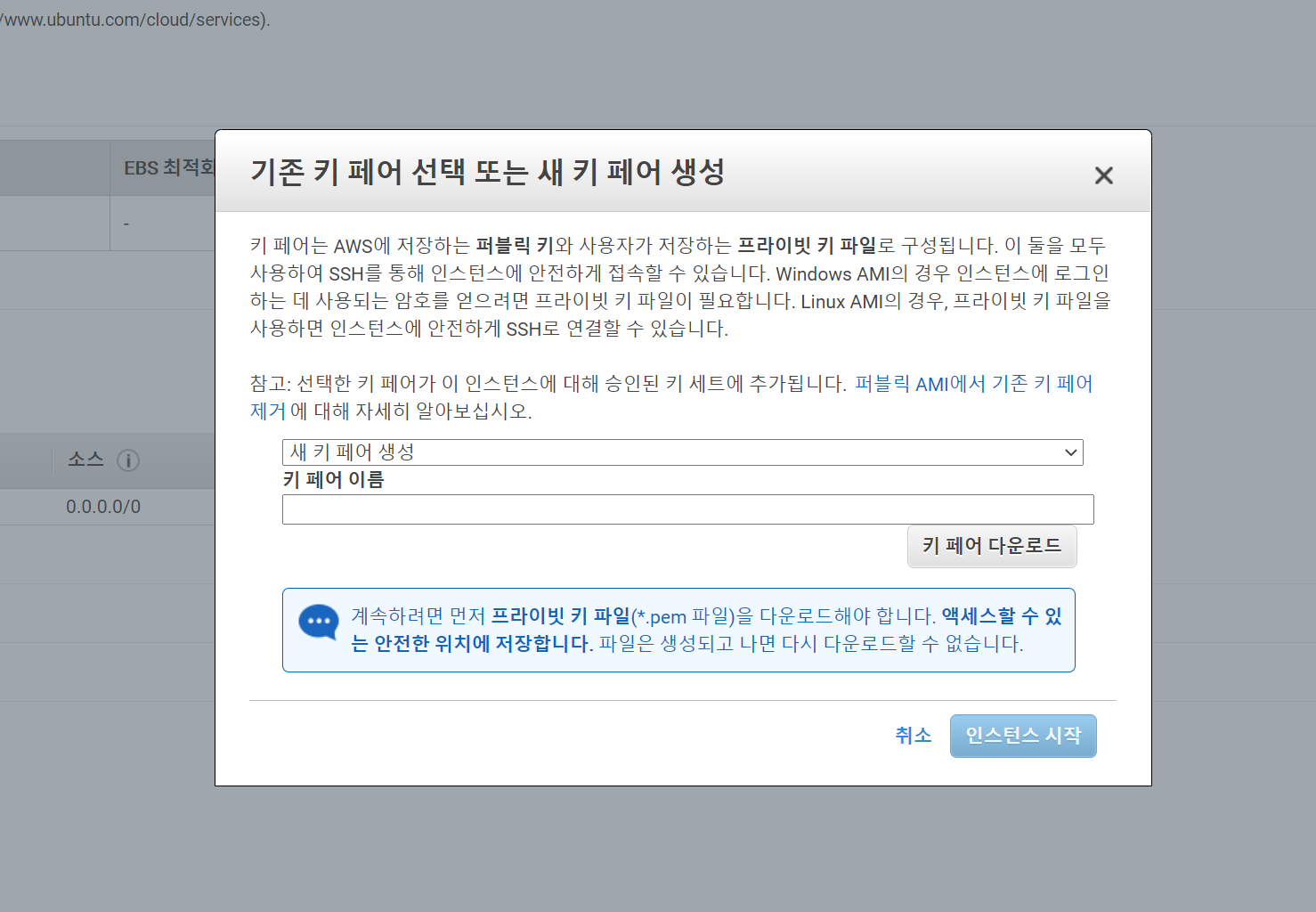 키페어라는 것인데 이게 없으면 ftp나 텔넷으로 접속할 수가 없다. 키페어 이름을 입력하고 키페어 다운로드 버튼을 눌러 키페어를 다운받고 잘 보관해두자. 나중에 쓴다.