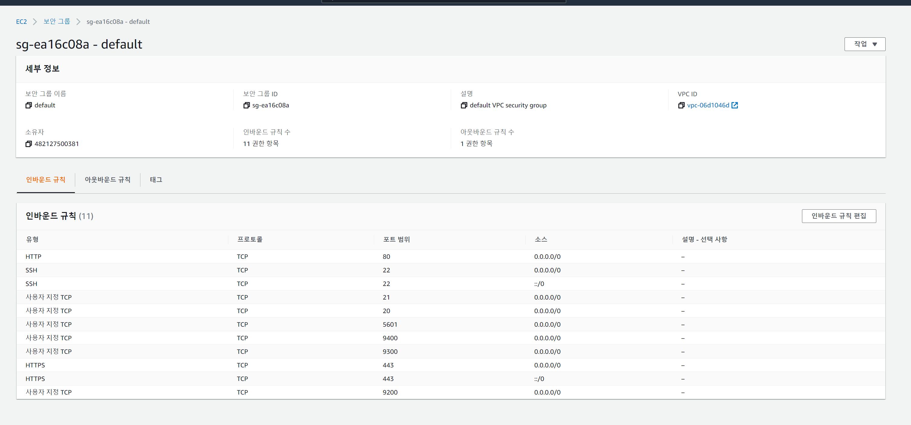 내가 세팅해 놓은 default 보안 그룹 세팅이다. 이걸 보고 똑같이 만들면 된다. 물론 여기에는 일반적으로는 안쓰는 규칙도 있지만 그냥 다 써놔라. 언젠간 쓰겠지.