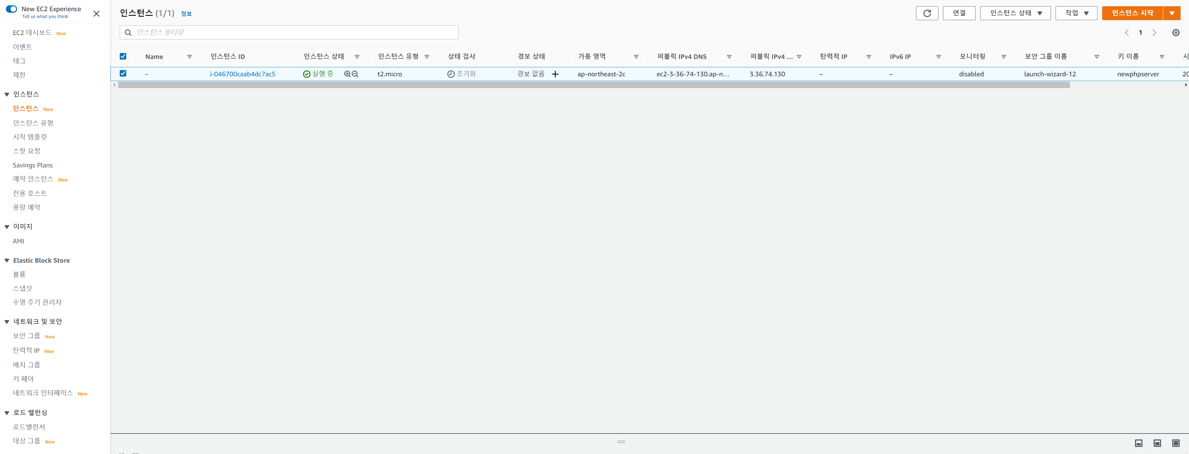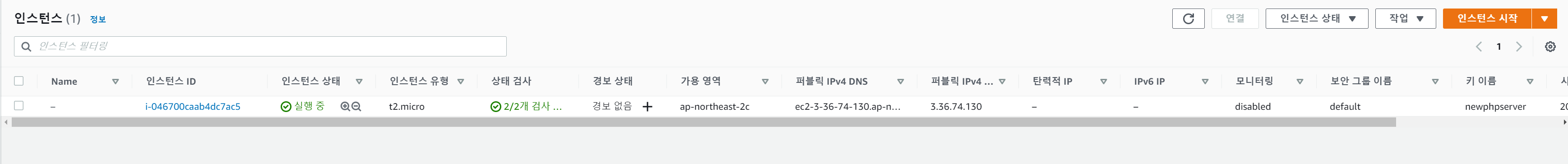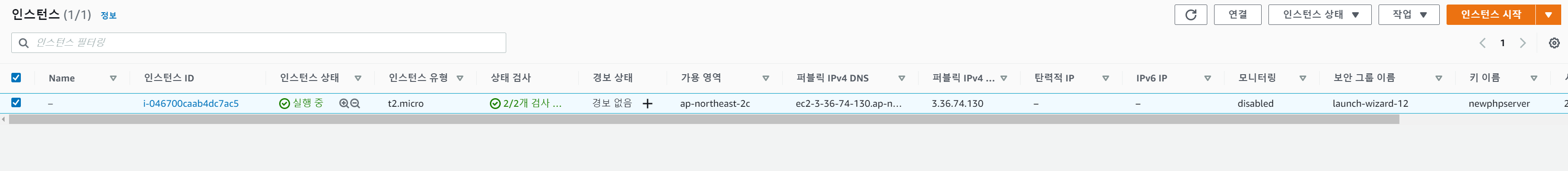 여기서 눈여겨 봐야할 것은 퍼블릭IPv4주소와 퍼블릭 IPv4 DNS 다. 나중에 텔넷 접속할때 필요한 주소다. 물론 ftp나 웹으로 접속할때도 저 주소를 사용한다. PHP서버를 구축하고 나면 저 주소로 접속해 볼것이다.