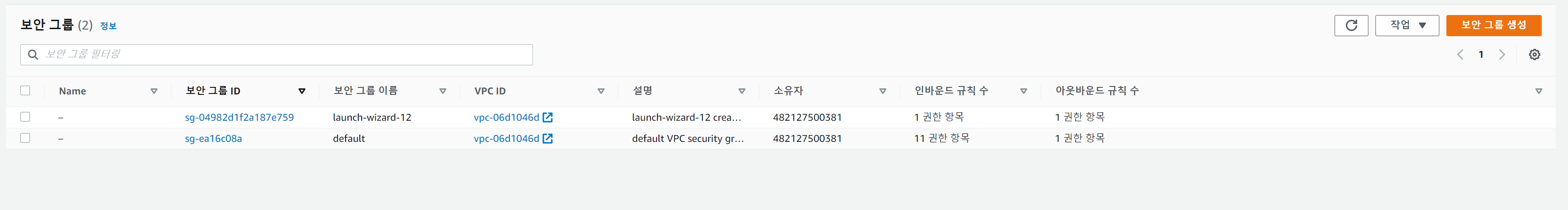 처음 만들면 보안그룹이 몇개가 있는지 잘 모르겠는데 보안그룹이름중에 default만 보면 된다. default를 클릭한다.