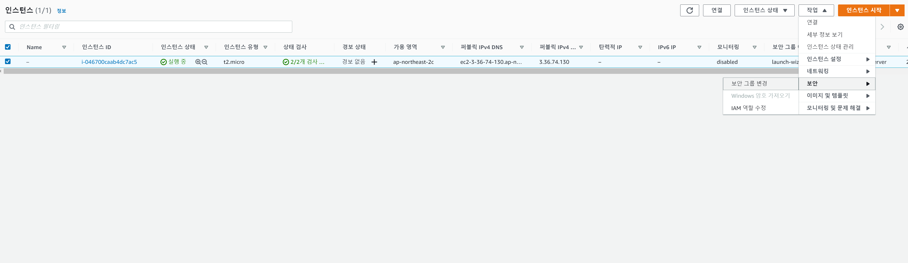 내가 만든 인스턴스가 선택돼 있는 상태에서 오른쪽 위 메뉴중 작업이란 넘을 누른다. 거기서 보안 > 보안그룹변경을 클릭한다.
