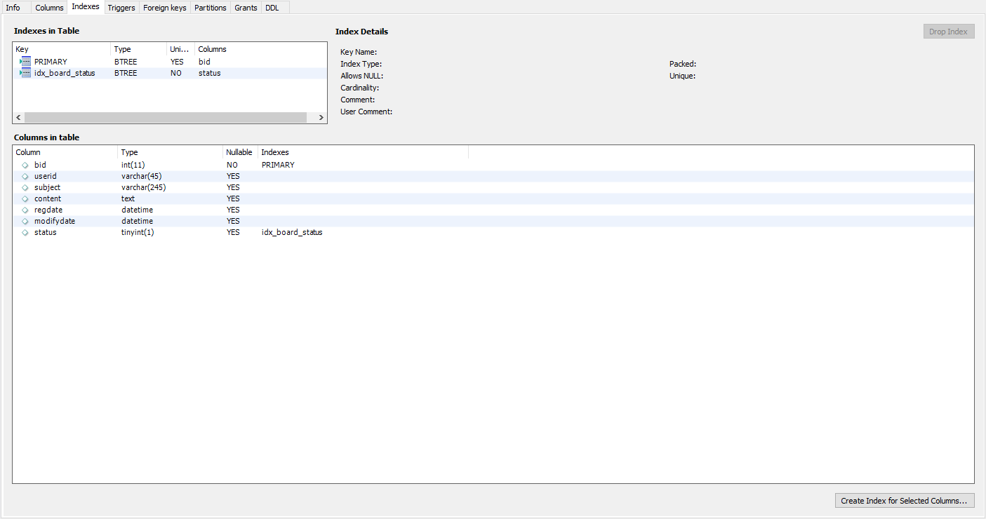 테이블에 인덱스를 잡는 기준은 대부분 where 절의 뒤에 오늘 칼럼이다.