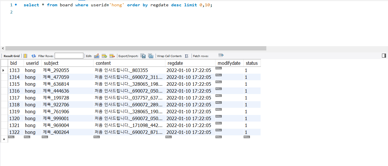 select * from board where userid='hong' order by regdate desc limit 0,10;
