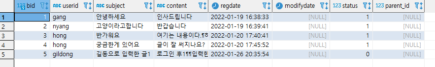 이렇게 parent_id라는 컬럼을 만들어준다. 현재는 값이 비어있다. 답글을 쓰는 경우에 여기에 부모글의 bid를 넣어줄 것이다.