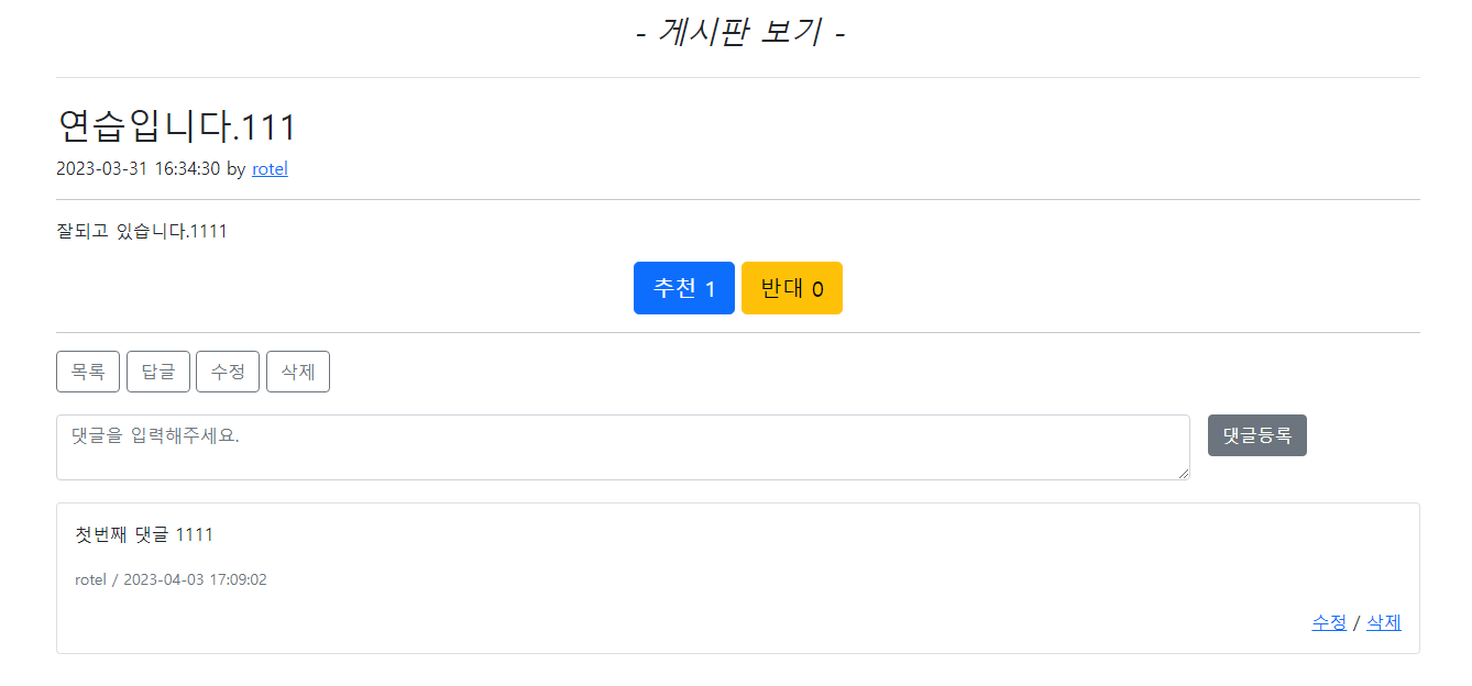 동일한 게시물에 같은 아이디로는 추천이나 반대를 한번만 할 수 있게 햇다. 그리고 마지막에 추천이나 반대의 토탈을 구해서 리턴해준다. 그리고 화면에 뿌려준다.