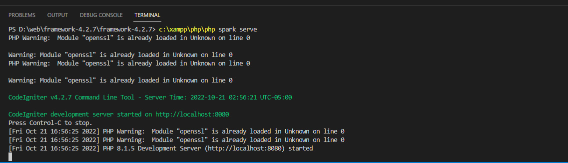 php는 php경로를 써준다. 나랑 경로가 다를 수도 있으니 xampp 설치할때 어디다 설치했는지 잘 찾아보자. 그리고 뒤에 spark serve는 ci4 웹서버를 실행해주는 명령어다. 엔터를 쳐보자.