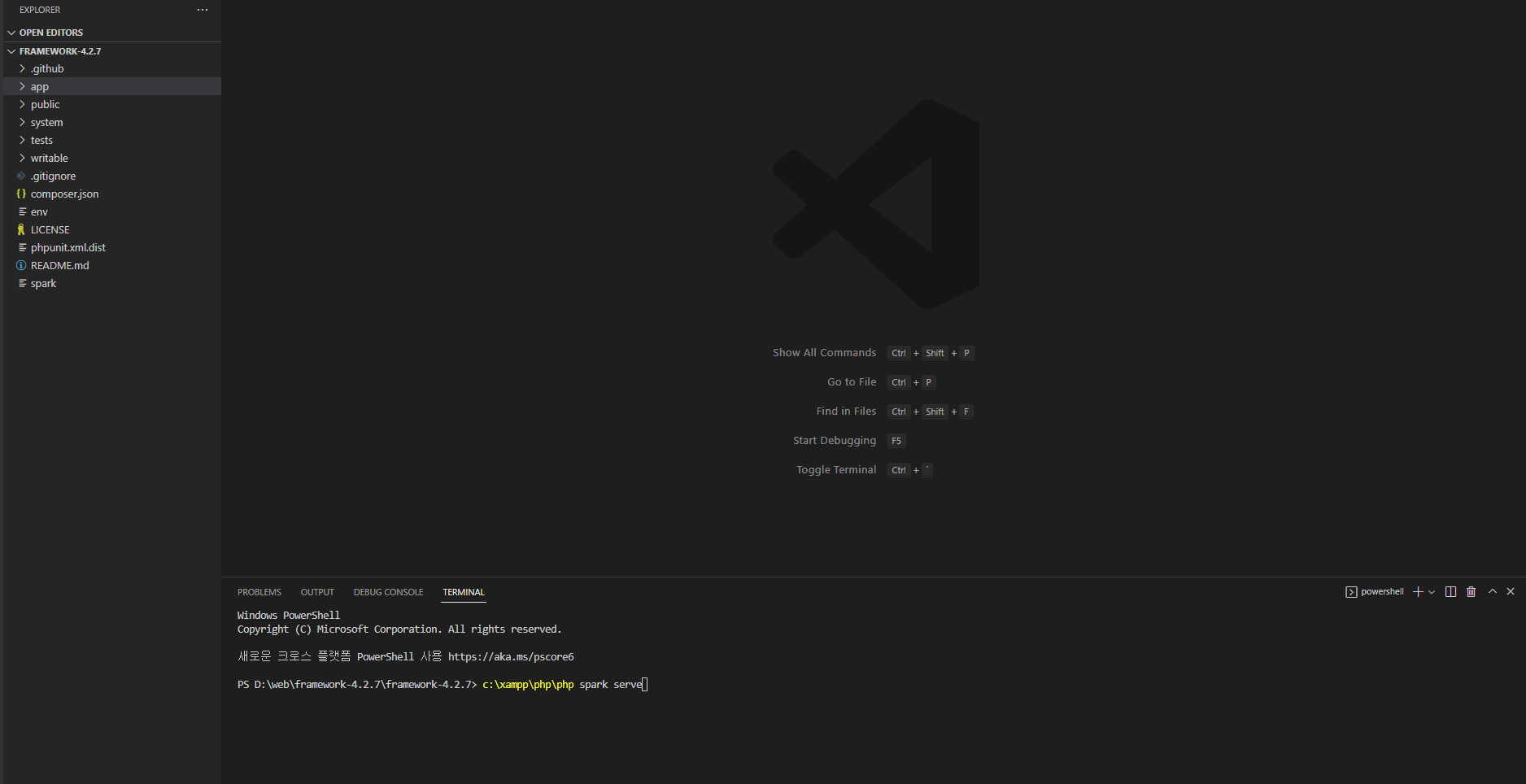 자 이렇게만 하고 ci4를 실행해보자. 전에는 xampp를 설치해서 아파치를 띄워주고 했지만 ci4는 그런거 없다. 자체적으로 서버를 실행할 수 있다. 물론 php는 설치돼 있어야한다. 전에 강좌에서 xampp를 설치했으면 있을거다.