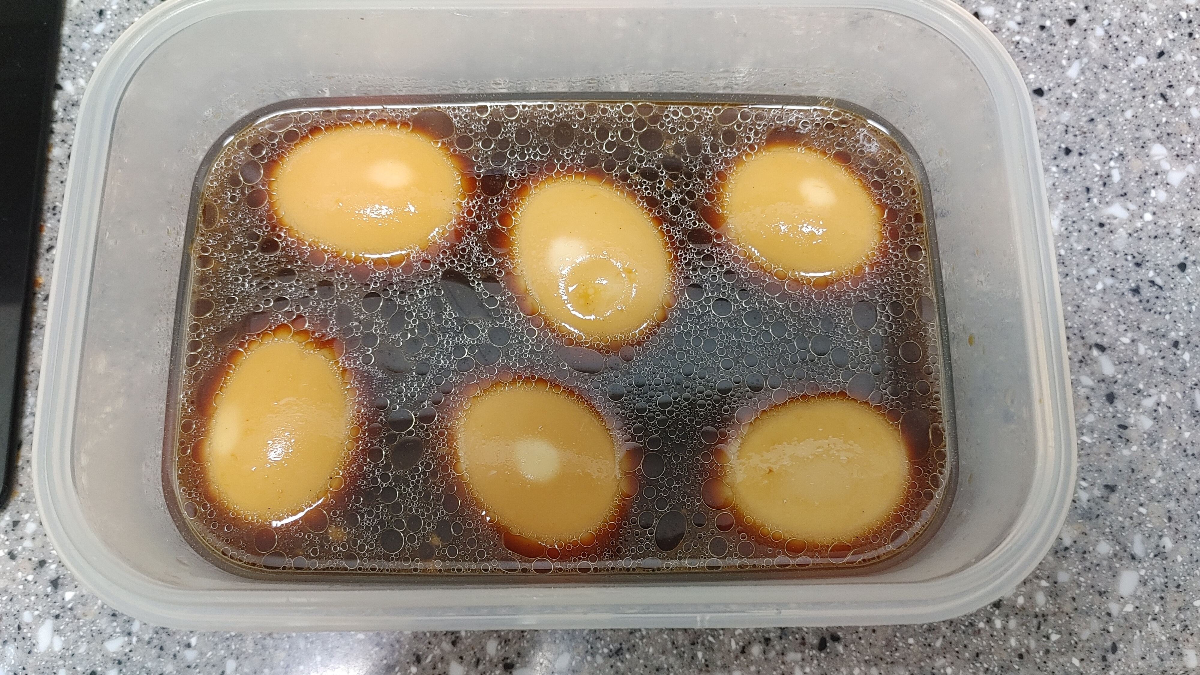 고기 끓인 물을 조금 떠내서 물과 섞어 간을 맞춰주고 삶은 계란을 넣어준다. 삶은 계란은 반숙을 하기위해 약 7분 끓여준다. 몇시간 마다 한번씩 뒤집어 준다. 색깔을 맞추기 위해.