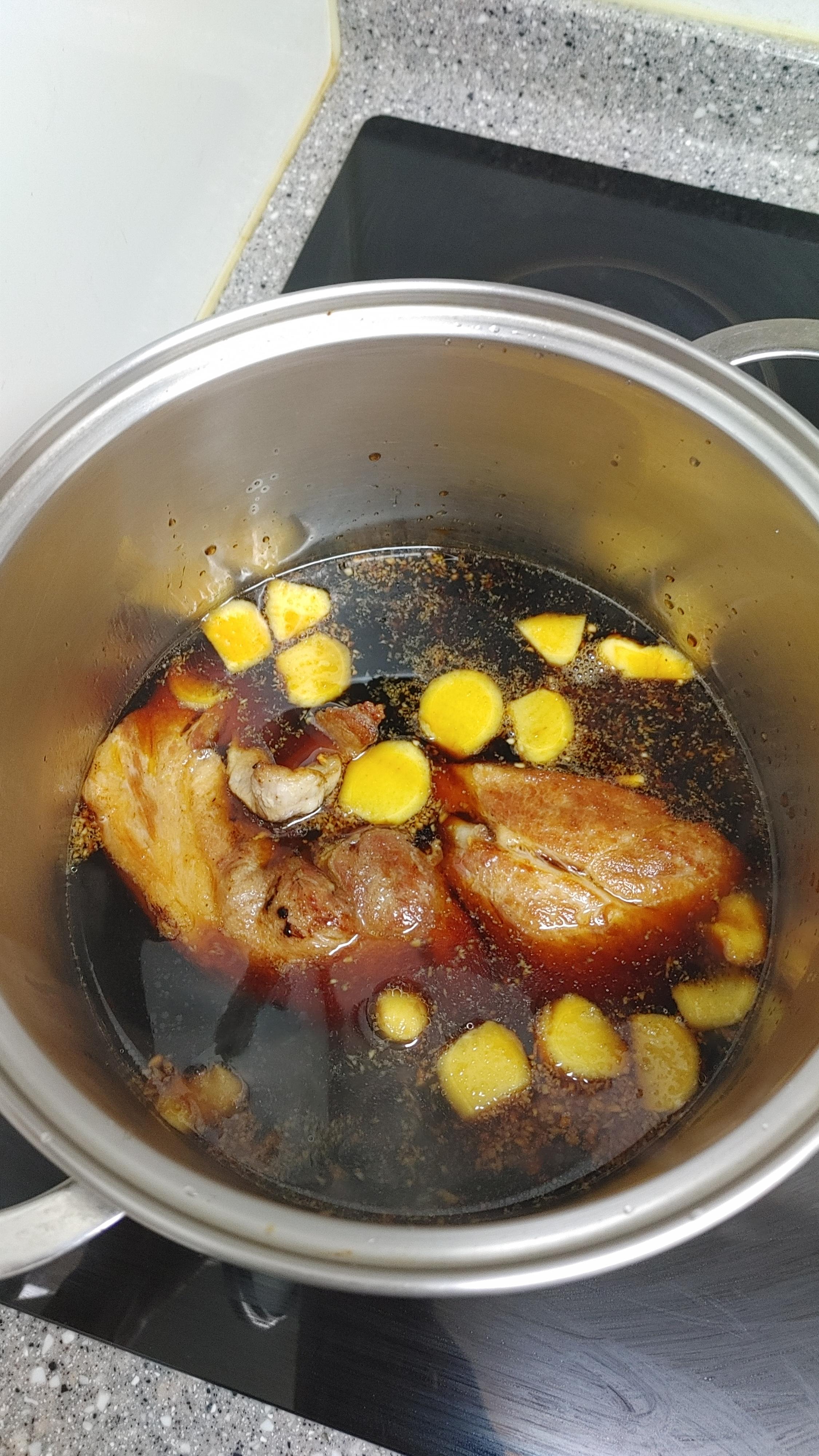 돼지 고기 약 1kg(아무 부위나 뭉탱이)을 물2:진간장2:미림1 비율로 넣은 물에 넣고