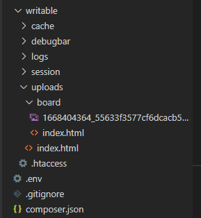 첨부한 파일을 board라는 폴더에 저장하라는 뜻이다. 그런데 board는 어디에 있는 board란 말인가? 위 첨부한 이미지에 보듯이 CI4는 기본적으로 /writable/uploads/아래에 등록하게 된다. 거기에 board라는 폴더를 옵션으로 주었기때문에 그 아래board라는 폴더에 파일을 저장했다.