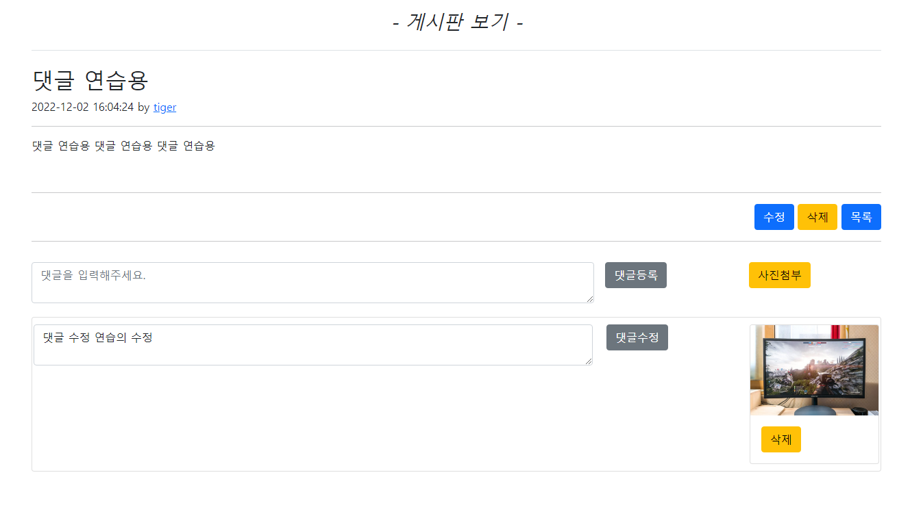 댓글을 수정하는 것이 쉽지 않다. 댓글을 수정할때 댓글에 첨부 이미지가 있는 경우도 있고 없는 경우도 있다. 없는 경우엔 파일을 첨부할 수 있게 해야 하고 있는 경우엔 기존 파일을 삭제하고 다시 등록할 수 있도록 해주어야 한다. 해보자.