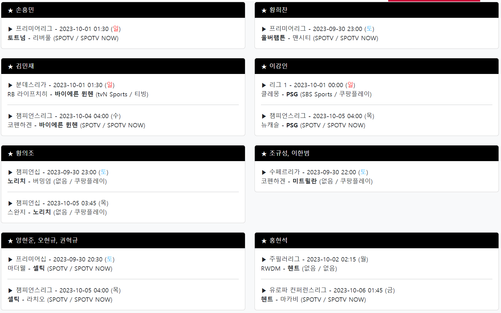 | 주말 해외파 축구 경기 중계 일정을 알아보자. 다음주 챔스도. (0) | 2023.09.15 |