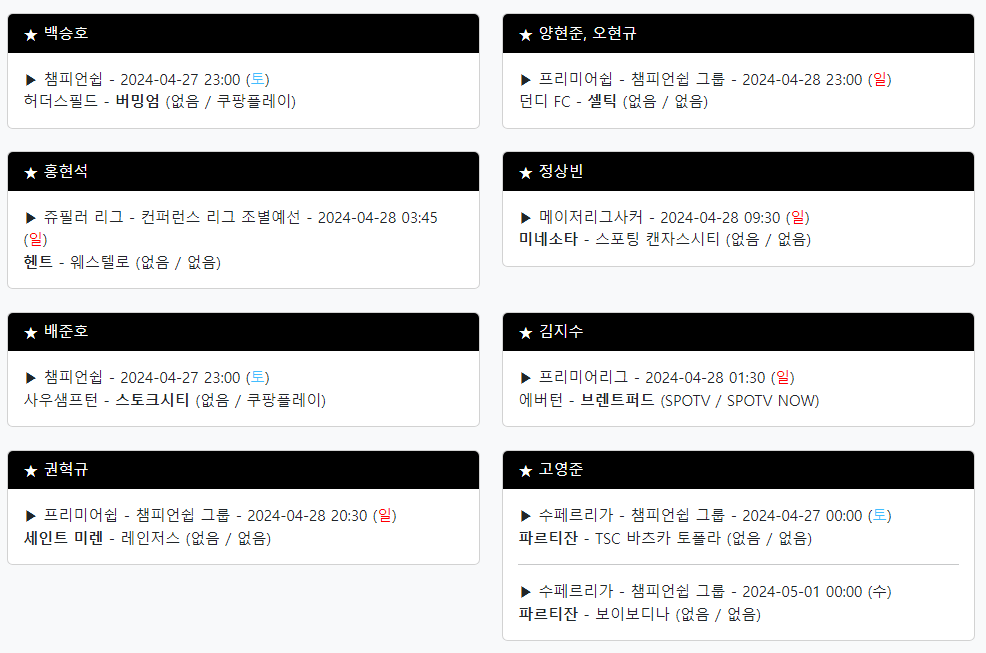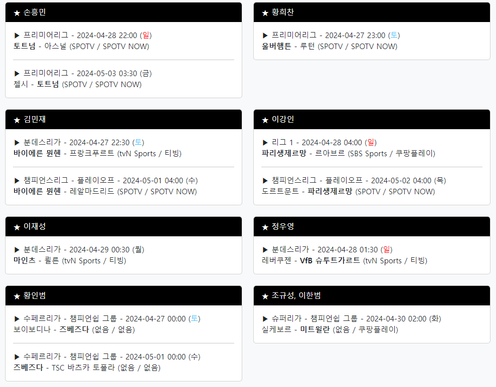 | 이번 주말 해외파 축구 경기 중계 일정, 손흥민, 김민재, 이강인, 황희찬등 (1) | 2024.02.29 |