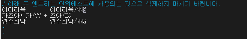 이렇게 등록해준다. 가운데 비어 있는 부분은 Tab이다. 저장하고 나온다. 이렇게 끝나면 좋겠는데 Khaiii를 다시 빌드 해주어야 한다.