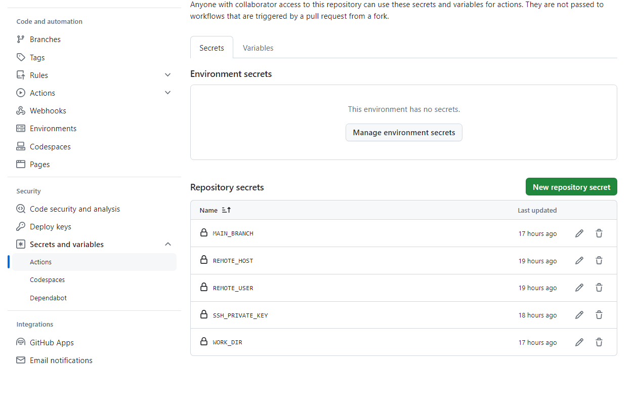위 화면처럼 변수를 만들어 주자 New repository secret 버튼을 눌러 등록한다.