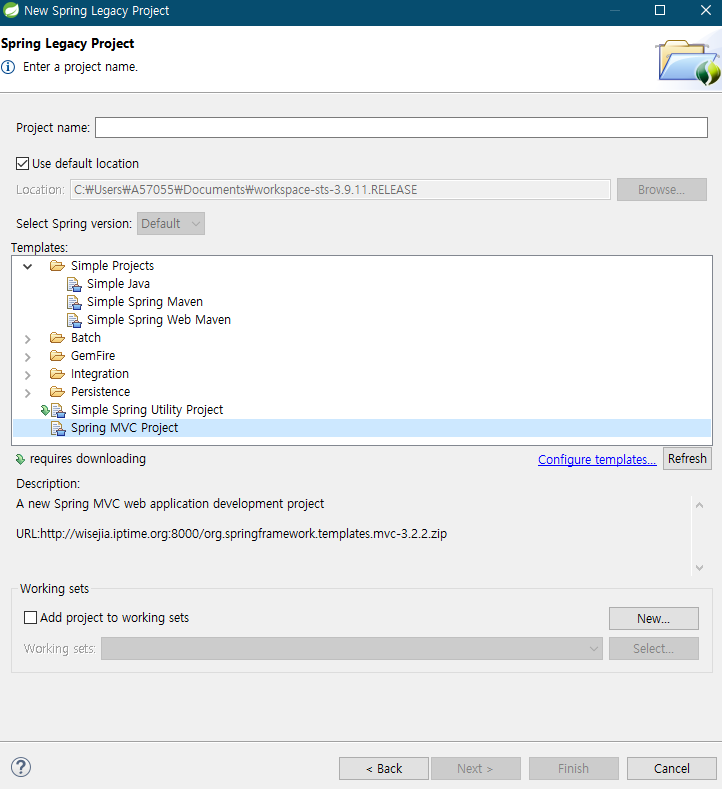 스프링을 처음할때 새로운 프로젝트 생성하면서 보통은 Spring Legacy Project를 선택하고 그 다음에 다음과 같이 Spring MVC Project를 선택해야한다.
