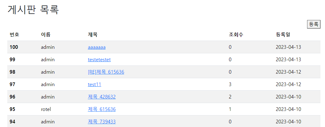 $boards로 넘겨주었으니 해당 변수로 받아서 뿌려준다. 이제 화면으로 확인해보자.