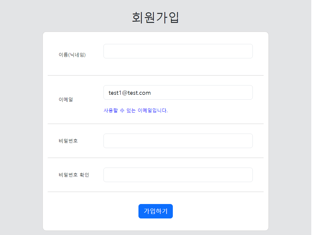 ps:여기부터는 안해도 된다. 그냥 추가하는 것이니 꼭 안해도 된다. 회원 가입페이지에서 사용중인 이메일인지를 확인할 수 있는 ajax를추가해보려고 한다.