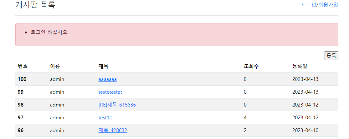 이제 로그인 안하고 등록 버튼을 누르면 자동으로 로그인 페이지로 넘어간다.