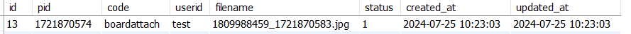 pid는 게시판의 bid값을 넣을건데 아직 게시판 테이블에 등록하지 않았기때문에 현재 시간을 timestamp값으로 넣어줬다. 게시판 테이블에 등록을 하면 고유 bid가 생길것이고 그때 pid값을 업데이트 해줄 것이다.