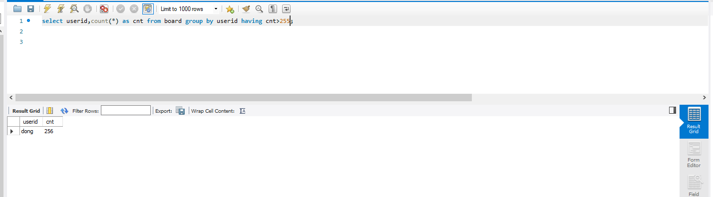 select userid,count(*) as cnt from board group by userid having cnt>255;