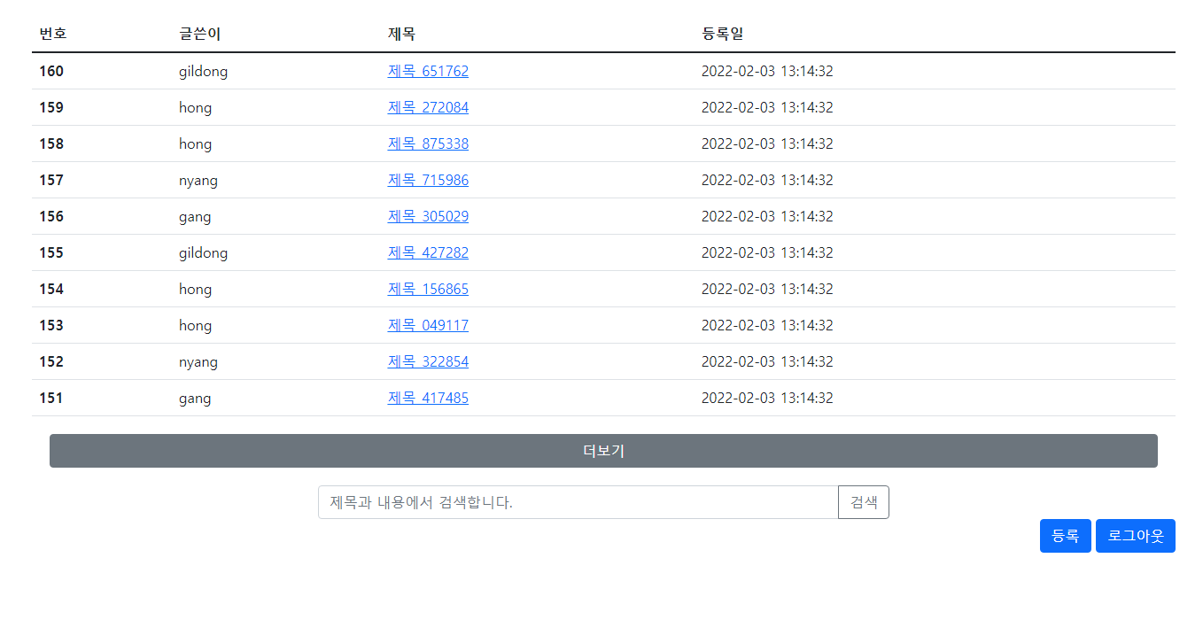 이렇게 바꿨다. 페이징은 주석처리로 감춰놨다. 새로 만든 더보기 버튼을 누르면 다음 페이지가 151번 게시물 아래에 나타나게 된다.