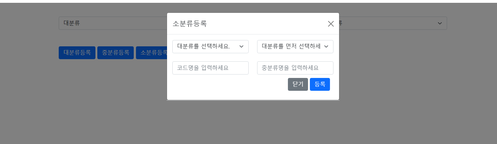 버튼을 눌러보면 대,중,소분류의 생성창이 나타난다. 창의 역할이 다르기때문에 화면에 보이는 부분도 다르다. 사용하는 ajax파일도 다른데 필요한 파일들을 만들어보자.