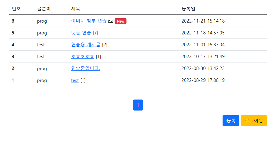 게시판 목록이나오는 화면을 조금 수정했다. 댓글도 표시하고 새로 등록한 게시물과 첨부한 이미지가 있는지 여부를 표시하도록 수정했다.